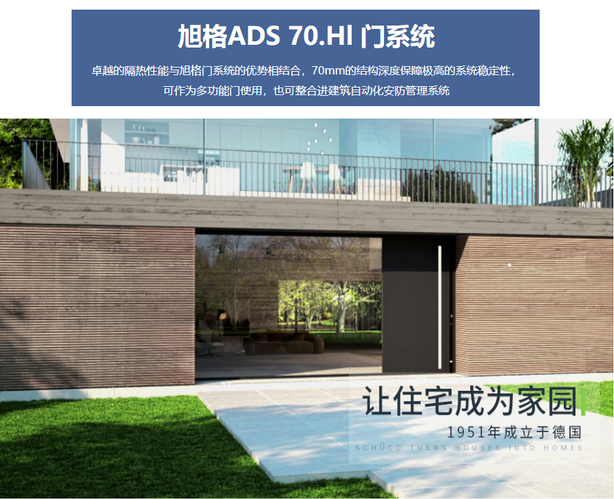 - 旭格ADS70.Hl門系統(tǒng)??卓越的隔熱性能與旭格門系統(tǒng)的優(yōu)勢(shì)相結(jié)合,70mm的結(jié)構(gòu)深度保障極高的系統(tǒng)穩(wěn)定性
